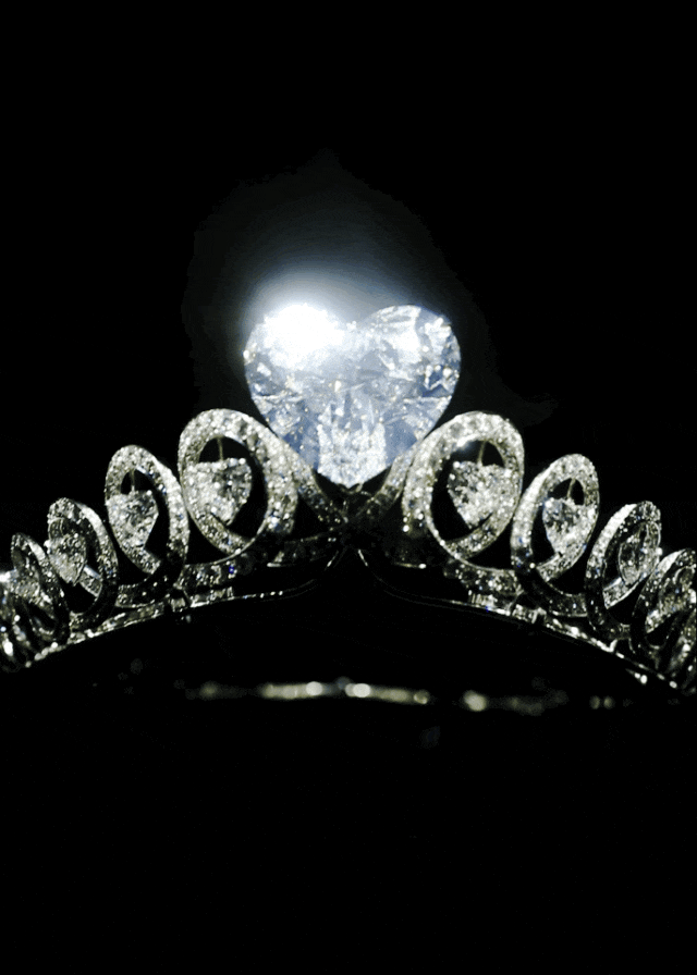 这枚冠冕当天自带“C位光环”。我尤其钟爱它的设计,18颗同样璀璨的心形钻石,垂吊于满钻镶嵌的“环圈”里,完美衬托出主钻的夺目。在Graff精湛、考究的切割和打磨之下,从任何角度观看,都散发出光芒,彰显Graff工艺的至高水准。