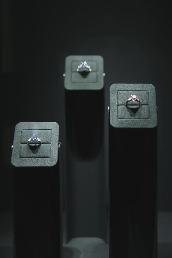 除了白钻之外,现场由粉红钻、艳彩蓝钻等彩钻打造的珠宝,同样让范主目不暇接。其中这组戒指作品,就展示出2.02克拉祖母绿形切割粉红钻,以及2.10克拉梨形切割艳彩蓝钻的精美绝伦,每一枚都是C位。