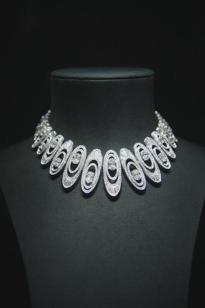 这条项链由立体同心椭圆形图案交织而成。闪耀的美钻,精心铺陈成利落的弧线。映耀着中央的椭圆形主钻,密镶深邃的祖母绿切割钻石,充满了优美的几何轮廓,给人感觉曼妙生姿,尽显前卫格调。