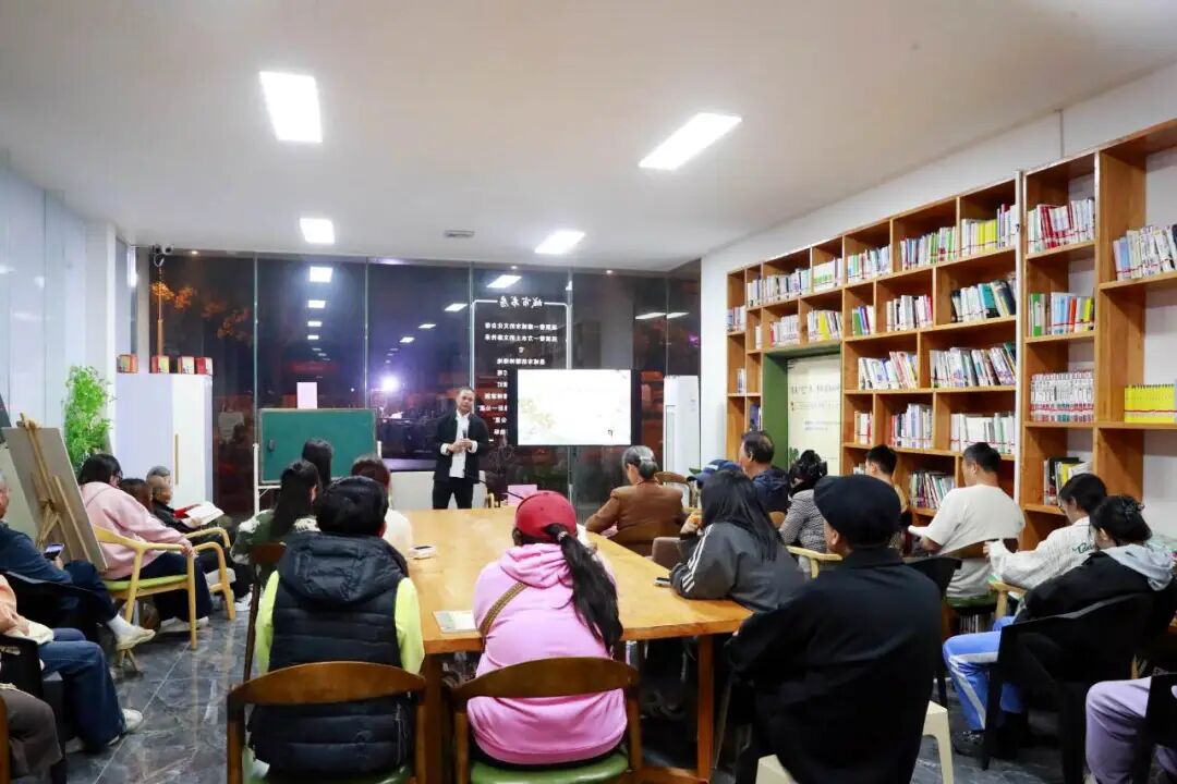 晚上8點,城市書房內燈光明亮,市民游客圍坐一團,參與一場“書香非遺年”主題沙龍。儋州市吟誦協會會長朱榮從儋州話發音特色講起,解讀儋州話文讀音吟誦的傳承價值,現場示范傳統吟誦,讓聽眾感受“詩鄉歌海”的古韻之美。互動環節,現場觀眾踴躍提問,就非遺傳承、技藝特點、書籍解讀等話題與嘉賓深入交流。現場擺放的書籍供市民翻閱品讀,形成“閱讀+分享+互動”的沉浸式體驗。