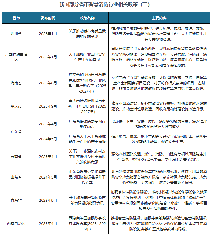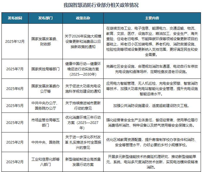 为促进智慧消防行业高质量发展,我国陆续发布了多项政策,如2025年12月国家发展改革委、财政部发布《关于2026年实施大规模设备更新和消费品以旧换新政策的通知》在继续支持工业、电子信息、能源电力、交通运输、物流、教育、文旅、医疗、设施农业、粮油加工、安全生产、海关查验、住宅老旧电梯、节能降碳环保等领域设备更新项目的基础上,将老旧小区加装电梯、养老机构、消防救援设施、检验检测等领域设备更新纳入支持范围,更好满足民生和安全需要。