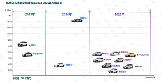 分布式电驱最开始是搭载在比亚迪的仰望U8上、仅接着极氪001FR也开始搭载应用,但碍于高昂定价(80-100万元)这两款车型在当时的销量并不是很理想。紧接着2024年,比亚迪又推出分布式车型腾势Z9/腾势Z9GT,把价格做到了33-40万元之间,加之仰望品牌突破高端的亮眼成绩,销量一度翻倍。